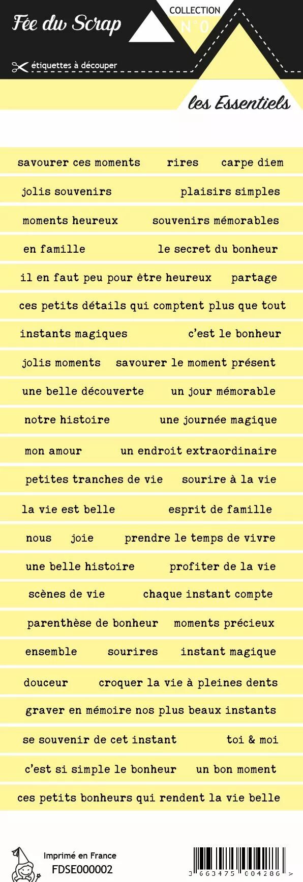 Accueil > Nos Marques > Fée du Scrap > étiquette les essentiels bande de mots jaune
