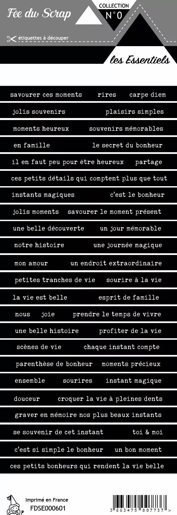 Accueil > Scrapbooking > Embellissements > Etiquettes > étiquette Les essentiels bandes de mots blancs fond noir