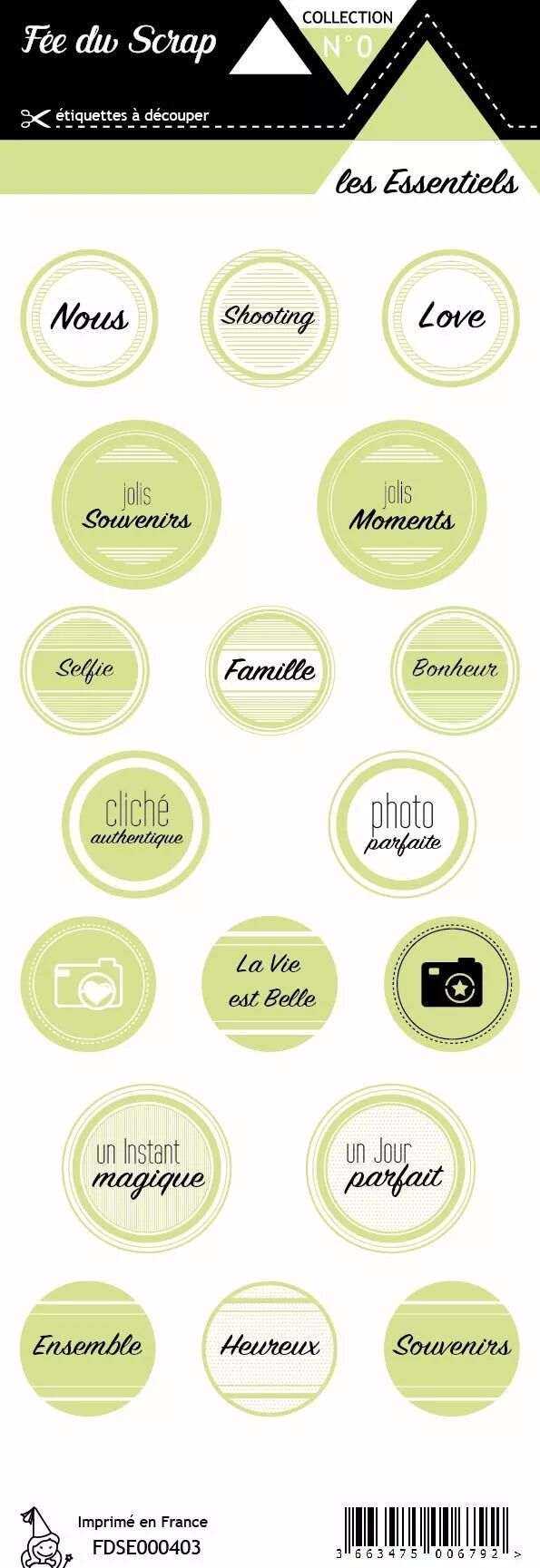 Accueil > Nos Marques > Fée du Scrap > étiquette les essentiels ronds avec mots vert pale
