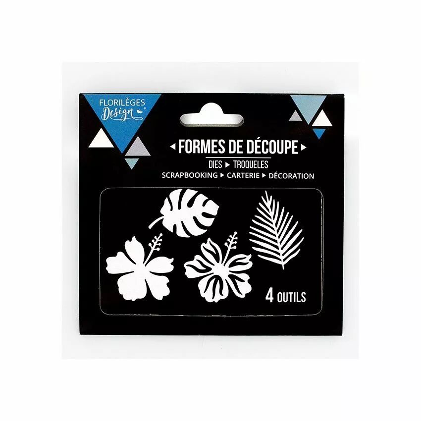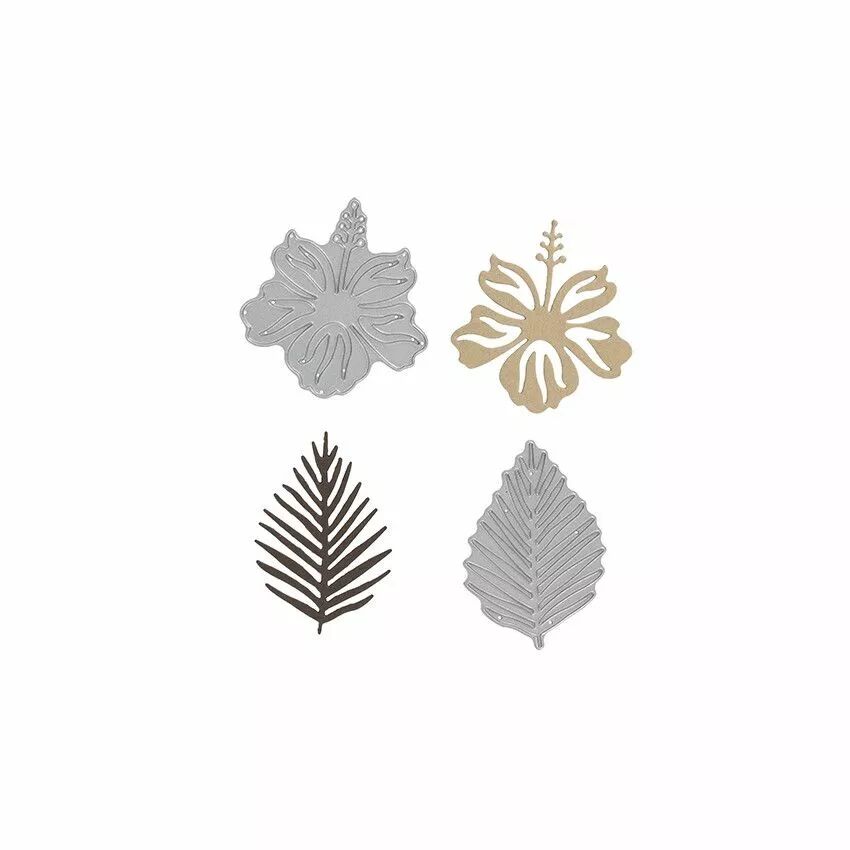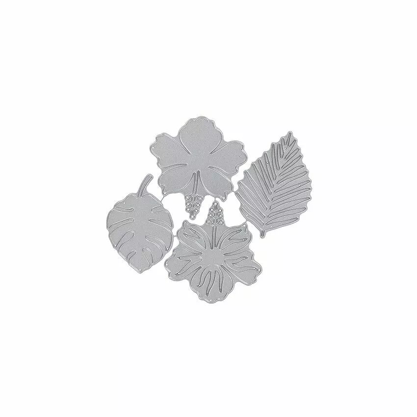 Dimensions :  4.1 x 3.9 cm (feuille exotique) , 4.9 x 4.9 cm (fleur 1) , 5 x 4.8 cm (fleur 2), 5.4 x 4 cm (feuille).