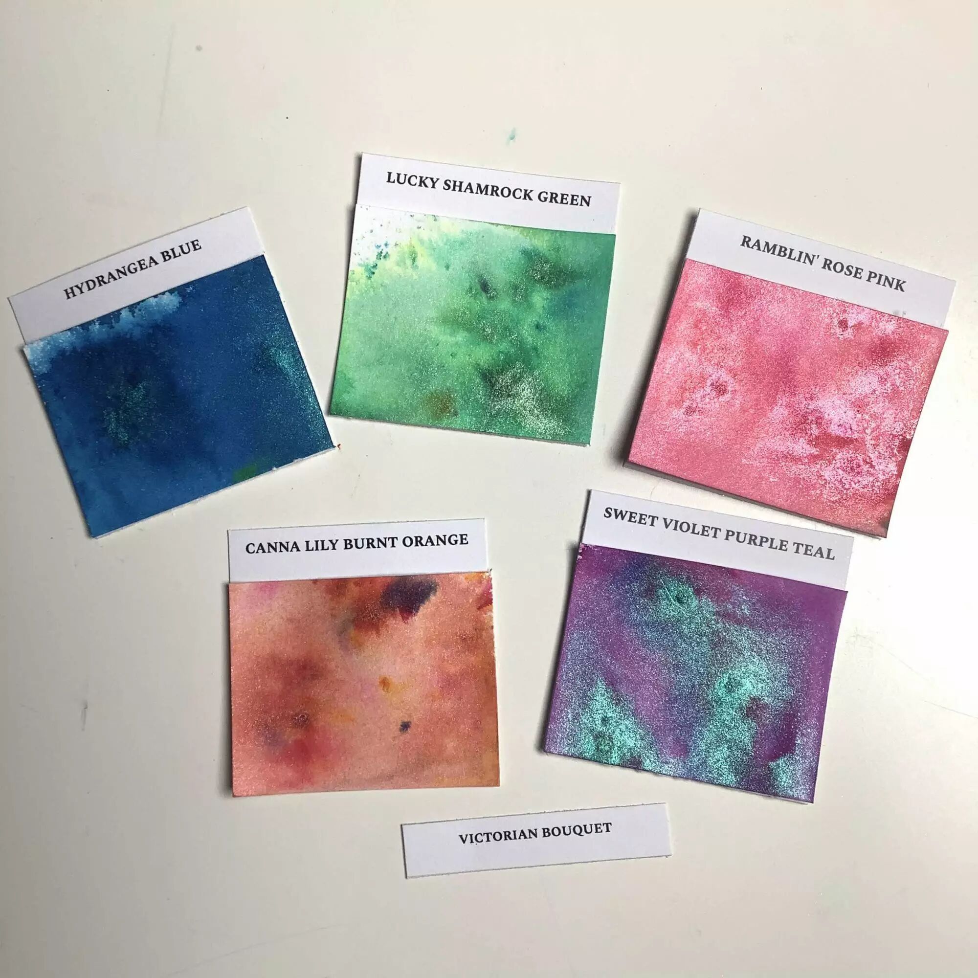 Ce set contient : Canna Lily Burnt Orange- Hydrangea Blue- Lucky Shamrock Green- Ramblin' Rose Pink- Sweet Violet Purple Teal