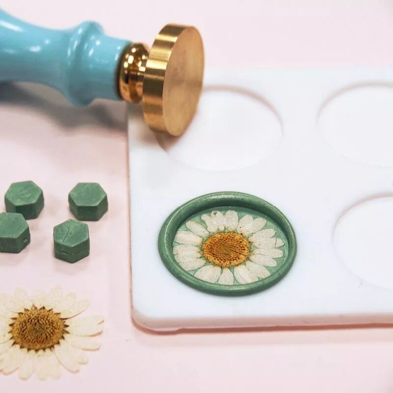 Remplissez le moule de cire, utilisez votre tampon en laiton pour créer un cachet fleur. Le moule est souple ce qui le rend flexible et facilite le démoulage.