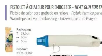 Le pistolet à chaleur Artemio chauffe à 290°C et est muni de 1 position de chauffe. Il convient pour sécher et embosser. Ce pistolet à chaleur Artemio vous sera très utile dans vos réalisations scrap, carterie, faire-parts, DIY, home déco...L'embossage vous permet de donner du relief à une poudre à embosser que vous appliquez sur une impression réalisée à base d'un tampon et d'une encre à séchage lent.