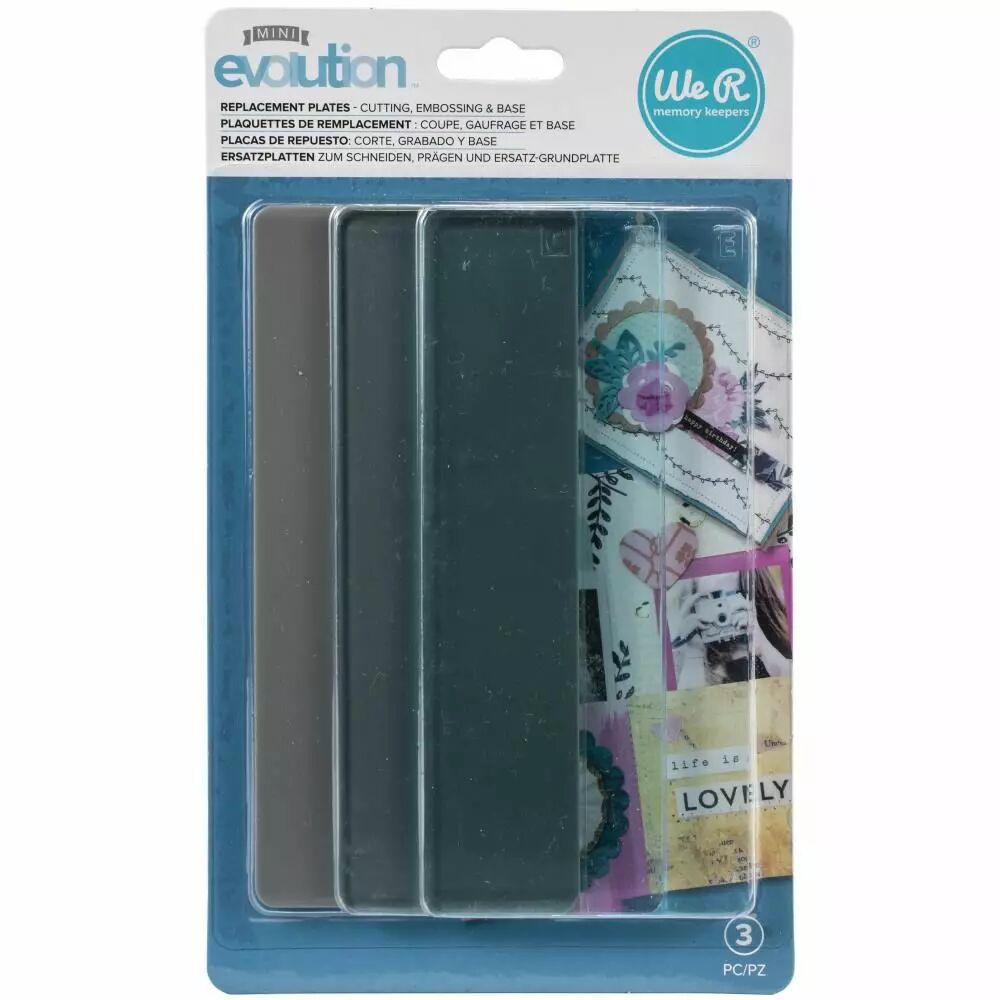 Les plaques de remplacement We R Memory Mini Evolution comprennent une plaque tampon, une plaque de coupe et une plaque de gaufrage. À utiliser avec la machine de découpe Mini Evolution (WR661629); vendu séparément. Les trois plaques mesurent 16,5*7,5 cm.